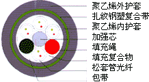 產(chǎn)品型號(hào): GYSTY53也叫(GYTY53) 光纖松套 纜芯填充油膏 金屬中心加強(qiáng)PE內(nèi)護(hù)套 雙面涂塑軋紋鋼帶粘結(jié)PE外護(hù)套